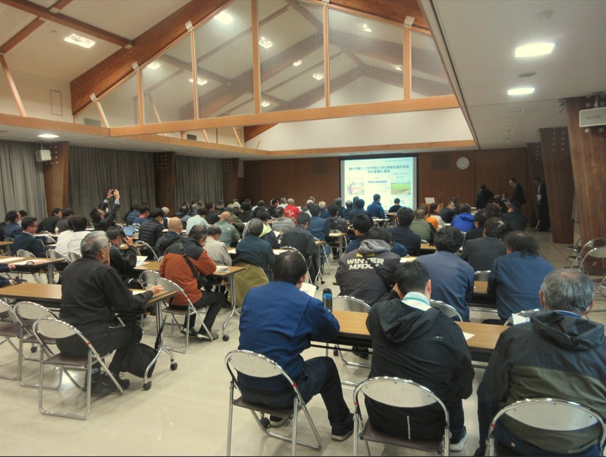 令和7年10月31日(金)14時00分より第16回水稲初冬直播きの生産者向け講習会を石川県金沢市の石川県農林総合研究センター農業試験場にて実施しました。生産者を中心に150名もの参加者があり、熱心に講演をきいてくださっており、多くの質問を受けました。播種作業はあいにくの天気のため実施できませんでしたが、前日に播種した圃場などの見学を行いました。