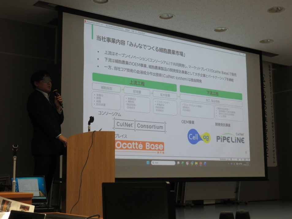 はじめに、インテグリカルチャー株式会社の川島一公様より、人口増加に伴うタンパク質需要の増加に対応するための培養肉などの細胞性食品の開発や、官能評価試験に関するご講演をいただきました。